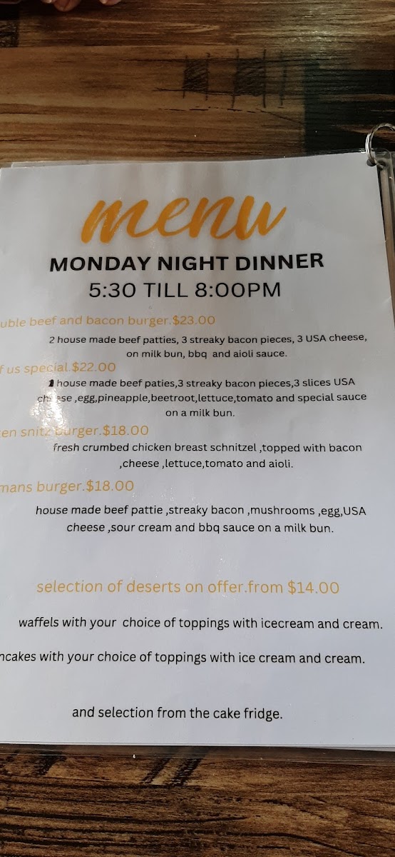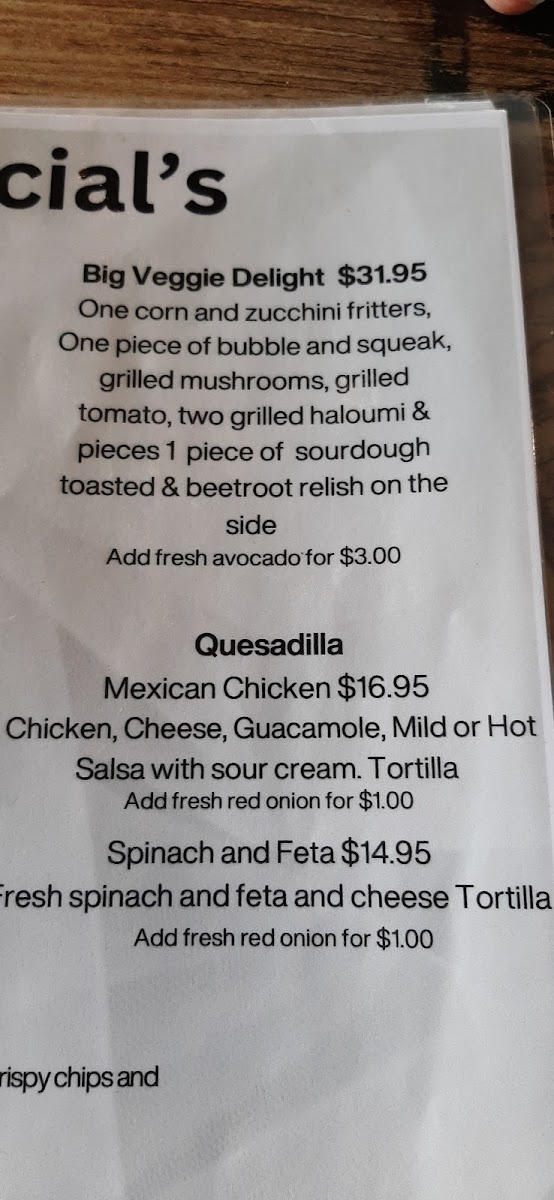 - Main Meals: Includes frittatas with sweet potato & pumpkin or spinach & fetta served with garden salad and chips, crumbed chicken schnitzel, panko crumbed calamari, battered fish, and a Mexican quesadilla option.
