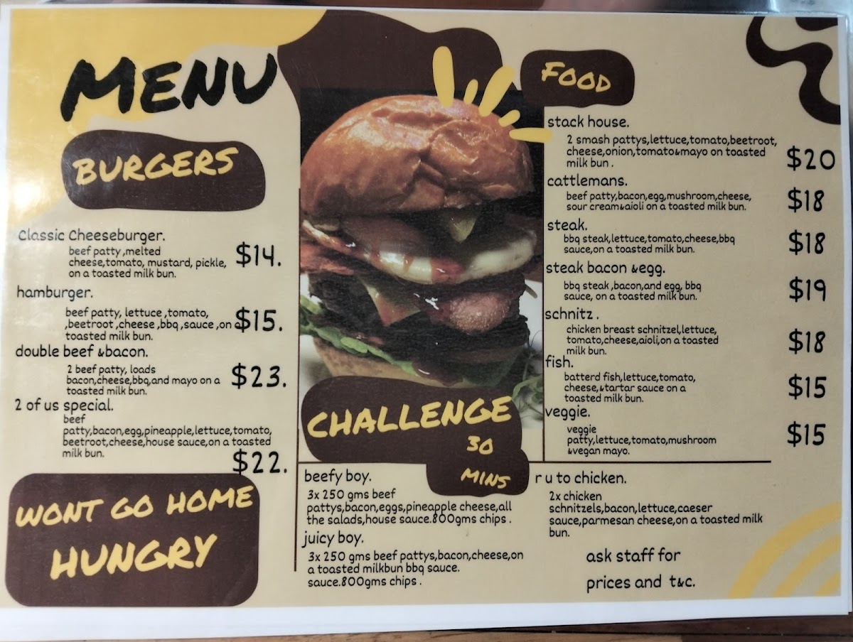 - Challenge Meals: Larger portioned meals consisting of multiple beef patties or schnitzels combined with bacon, eggs, cheese, salads, and sauces, served with chips.